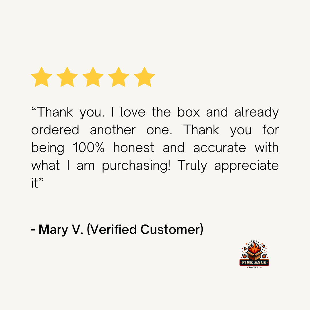 You can count on Fire Sale Boxes to get the job done. We pride ourselves in providing top-shelf service and products. We're looking to leave every buyer with an incredible experience from beginning to end. In doing so, we hope to establish lasting relationships with each customer so everybody wins!